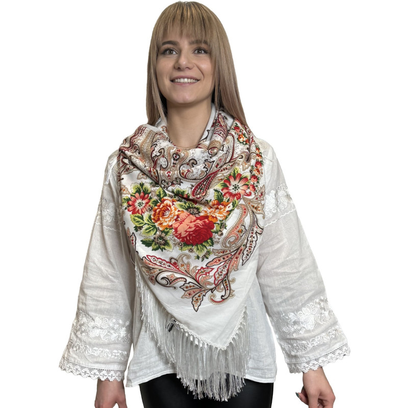 Chusta góralska zdobiona z każdej strony eleganckimi, opadającymi frędzlami. Piękny, ludowy motyw kolorowych kwiatów. Chusty są nieodłącznym dodatkiem do regionalnych strojów, ale możesz wykorzystać je również w codziennych stylizacjach jako ciepłą apaszkę.