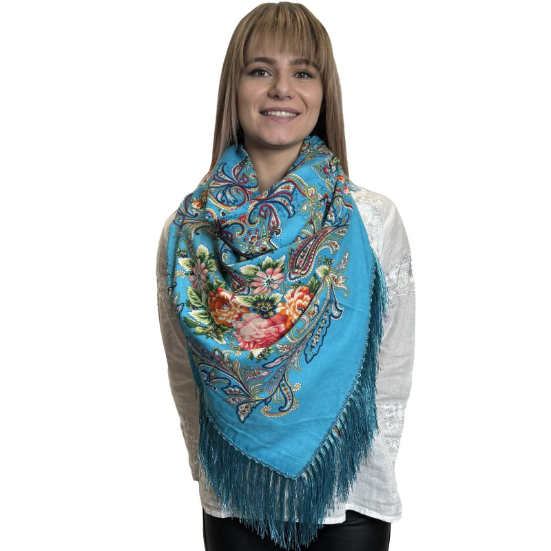 Chusta góralska zdobiona z każdej strony eleganckimi, opadającymi frędzlami. Piękny, ludowy motyw kolorowych kwiatów. Chusty są nieodłącznym dodatkiem do regionalnych strojów, ale możesz wykorzystać je również w codziennych stylizacjach jako ciepłą apaszkę.