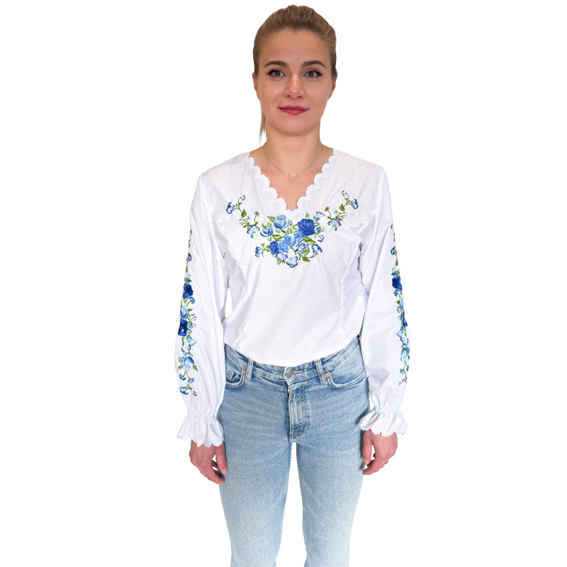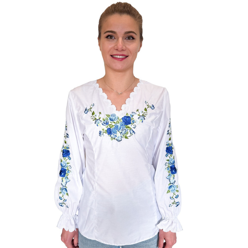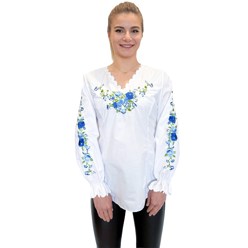 Produkt charakteryzuje się dopasowanym krojem z rozcięciami po bokach, co zapewnia swobodę ruchów przy jednoczesnym podkreśleniu sylwetki. Bogate, kwieciste hafty aplikowane są zarówno na dekolcie w kształcie litery V, jak i wzdłuż długich rękawków, które zakończone są mankietami na gumce z dodatkowymi falbankami. Taka dekoracja sprawia, że koszula staje się niezwykle elegancka i może być noszona zarówno na co dzień, jak i podczas bardziej formalnych okazji.