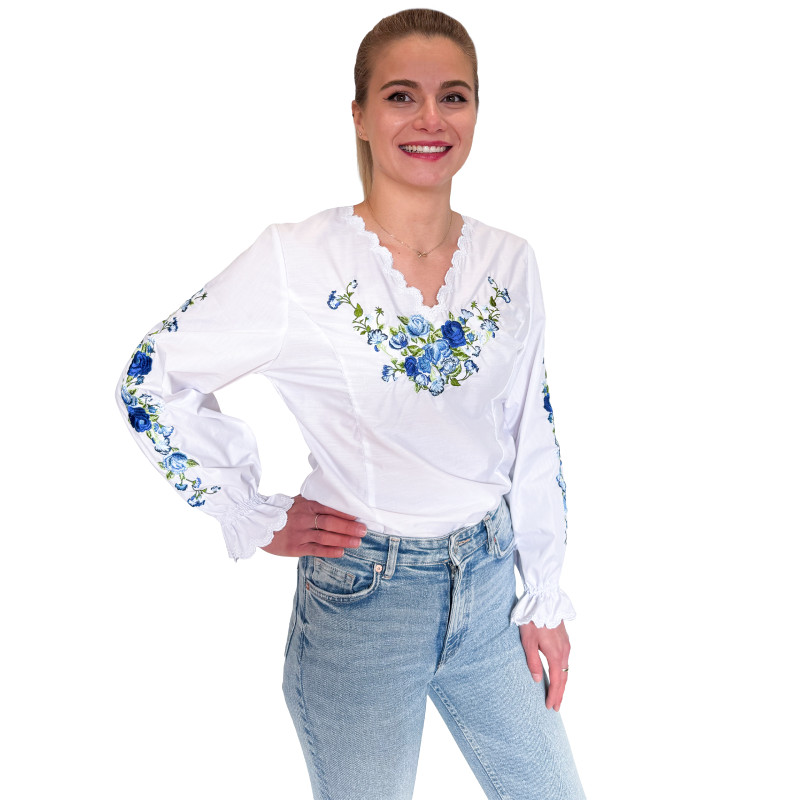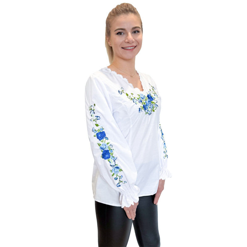 Taliowana koszula damska z rozcięciami po bokach. Zdobiona bogatym, kwiecistym haftem w regionalnym stylu. Długie rękawki zakończone mankietem na gumce z falbanką. Dekolt V wykończony delikatnym haftem. Koszula zapinana na kryty zamek wzdłuż linii talii.