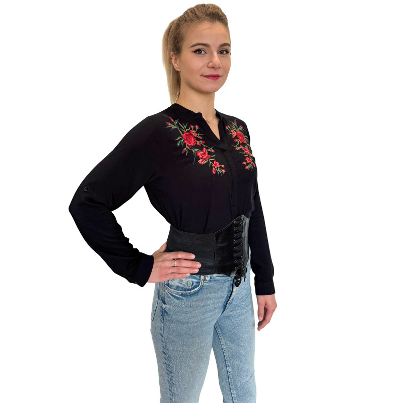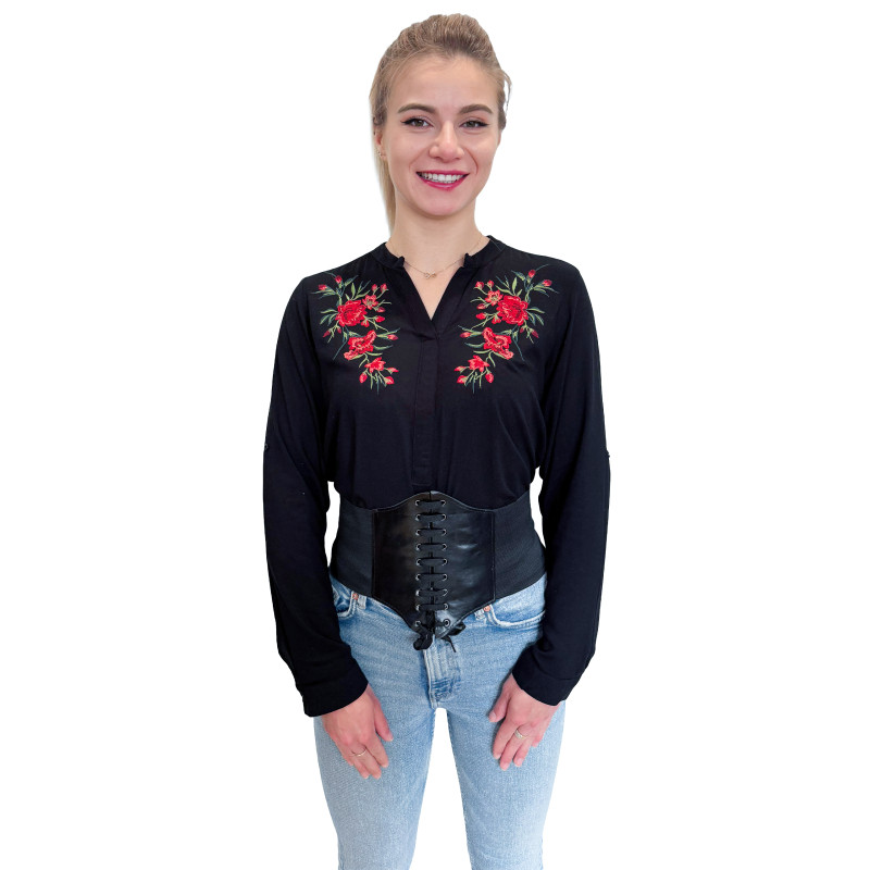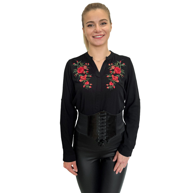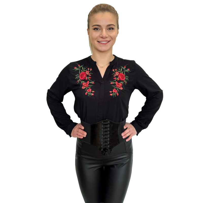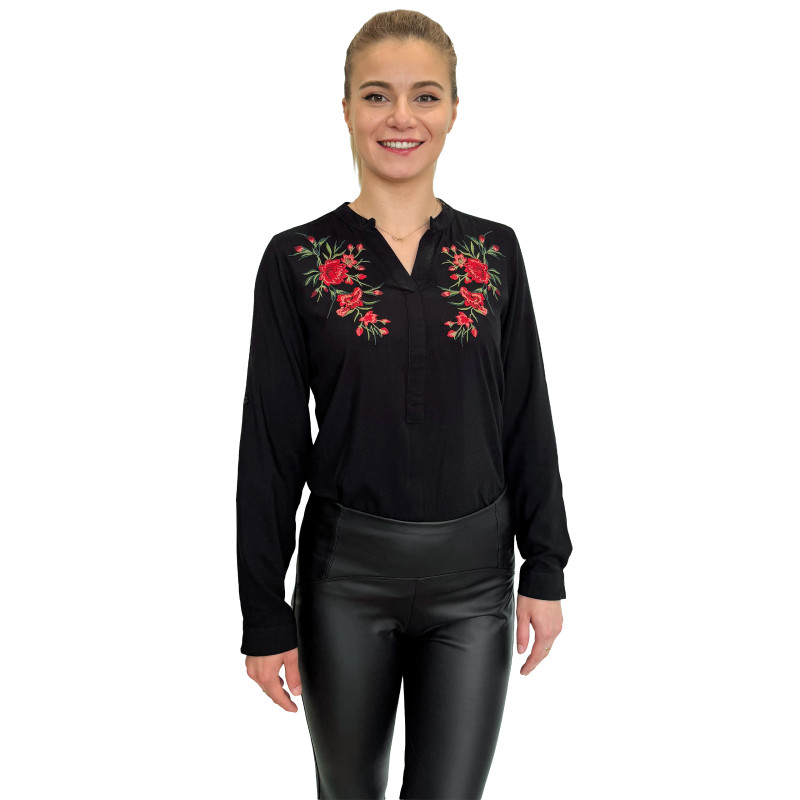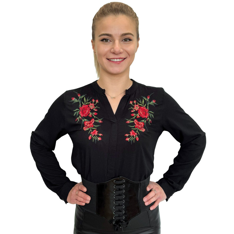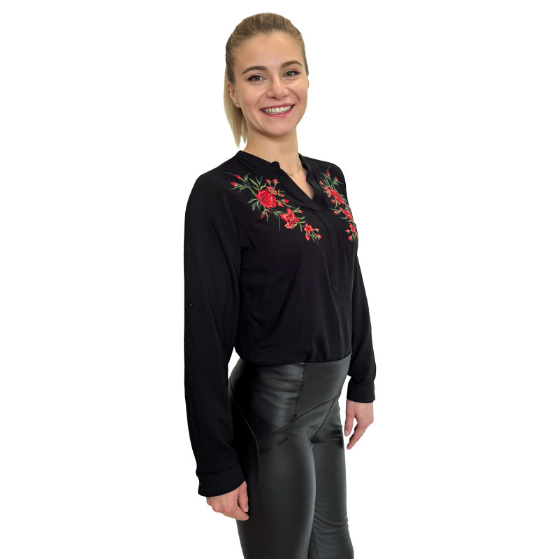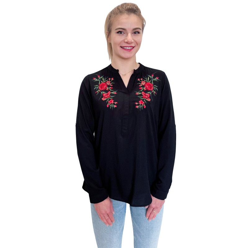 Wkładana przez głowę koszula damska ze stójką. Zdobiona ludowym, w całości haftowanym wzorem. Długie rękawki z możliwością ich podwinięcia i upięcia na długość 3/4. Asymetryczny tył. Koszula wykonana z miłej i przewiewnej dla ciała bawełny.
