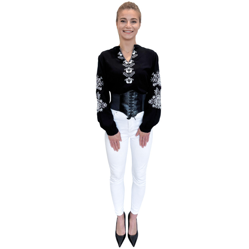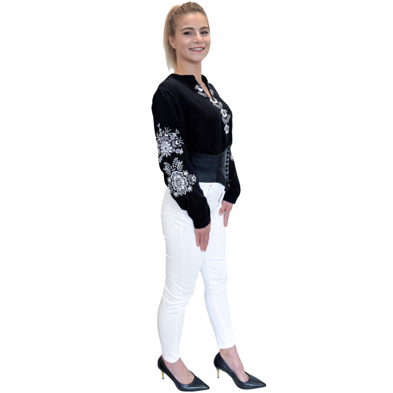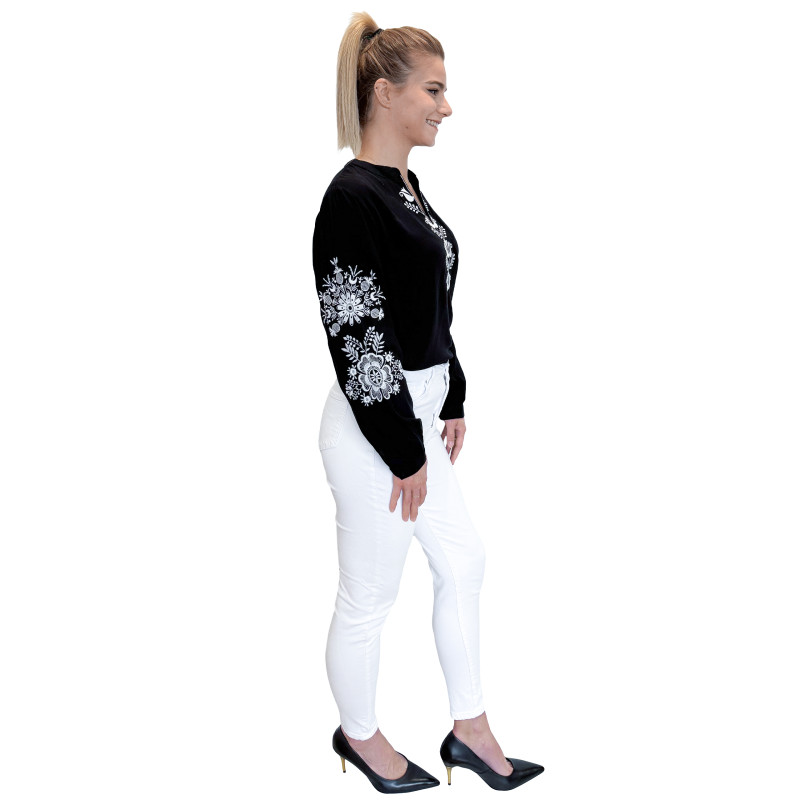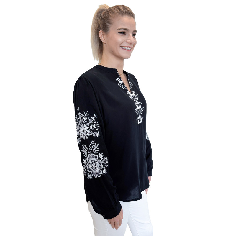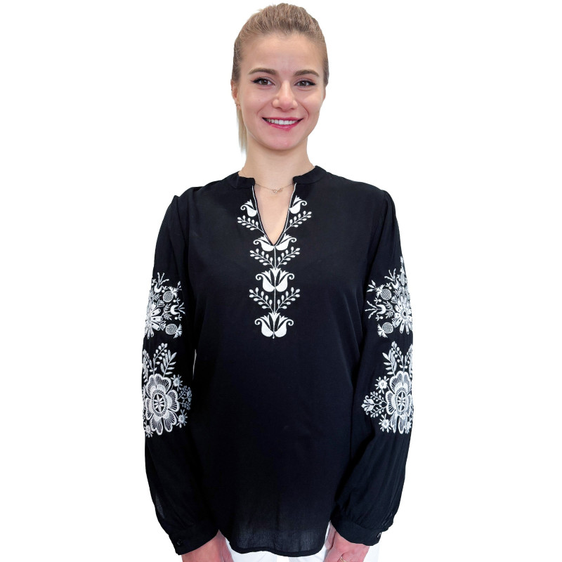 Wkładana przez głowę koszula damska ze stójką. Bogaty wzór w ludowym stylu jest w całości haftowany. Długie rękawki z możliwością ich podwinięcia i upięcia na długość 3/4. Koszula wykonana z miłej i przewiewnej dla ciała bawełny.