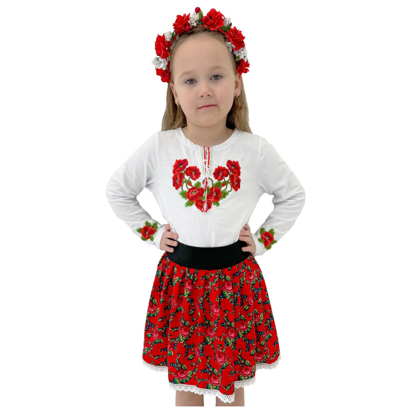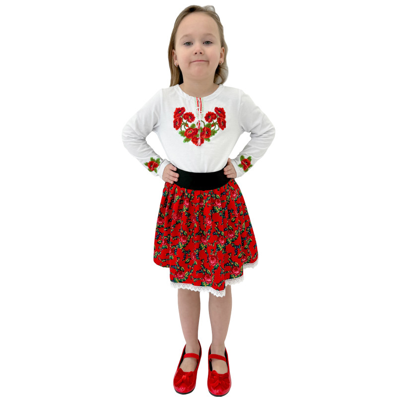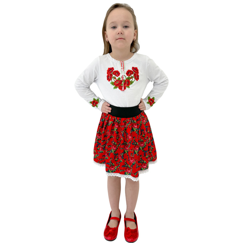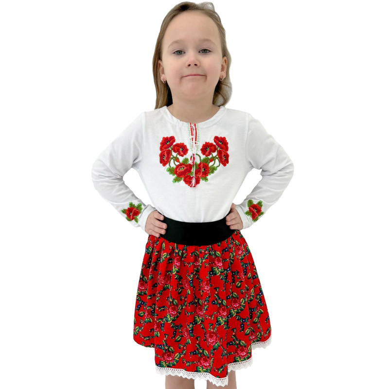 Dziewczęcy komplet składający się z białej bluzeczki haftowanej oraz spódniczki z bawełnianą koronką