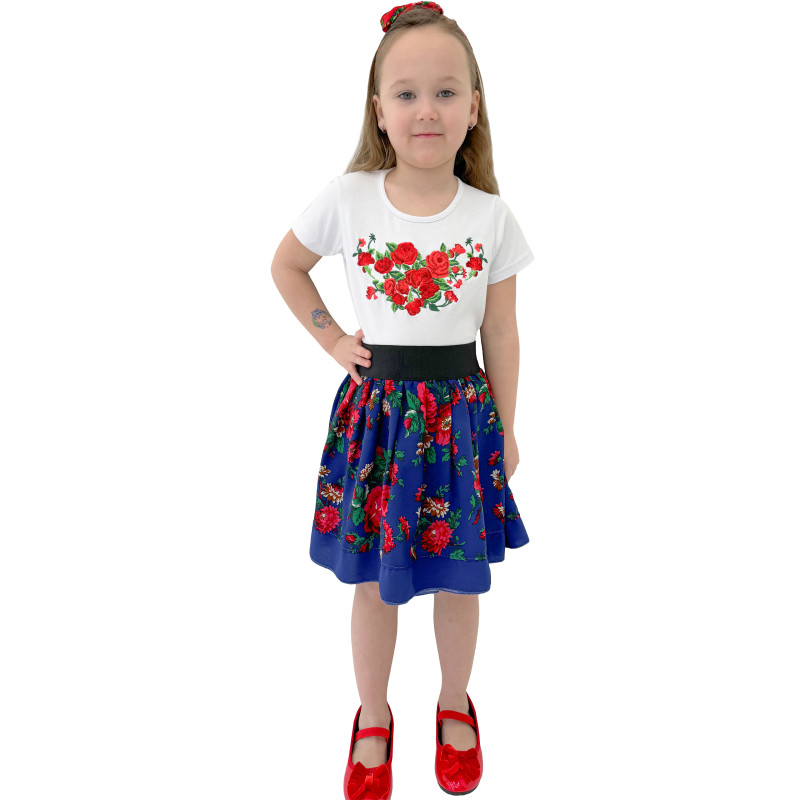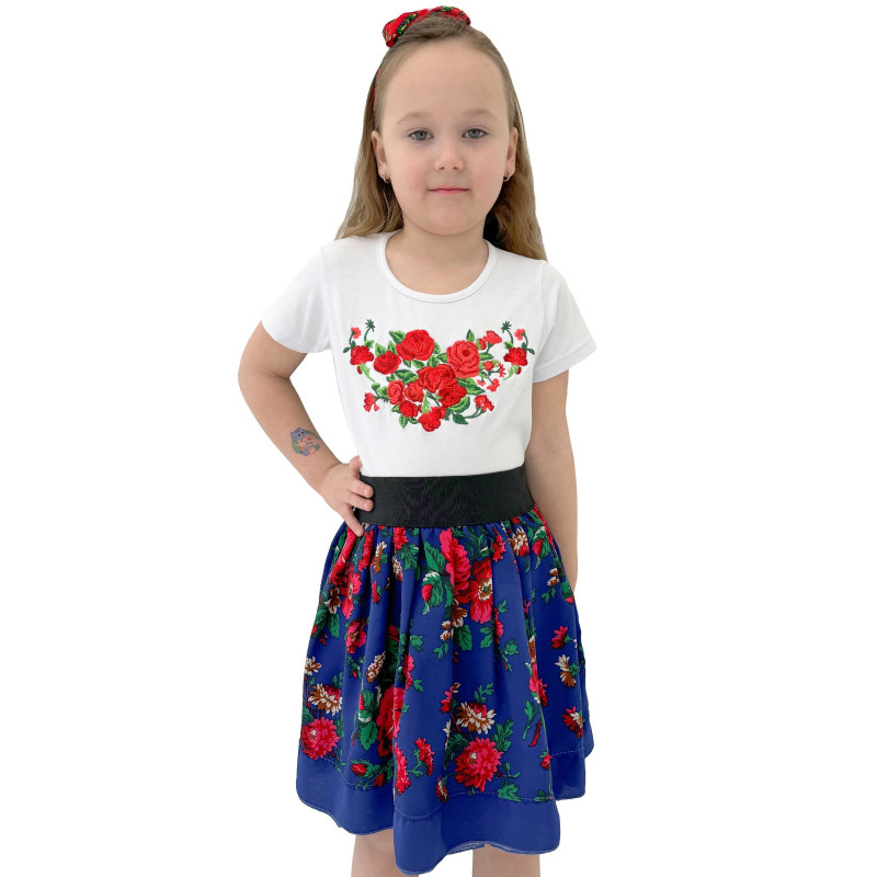 Dziewczęcy komplet składający się z białej bluzeczki haftowanej oraz spódniczki z podszewką