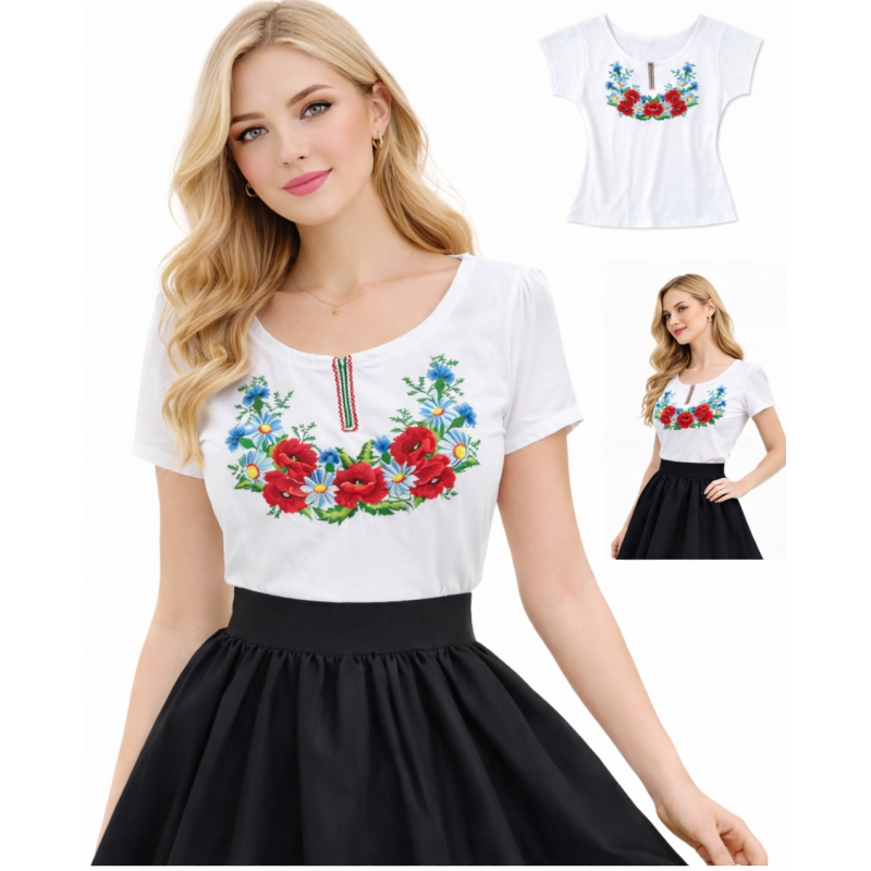 Koszulka damska z krótkim rękawkiem zdobiona haftem w regionalnym stylu. Ozdobne troczki przy dekolcie umożliwiające regulacje jego głębokości.