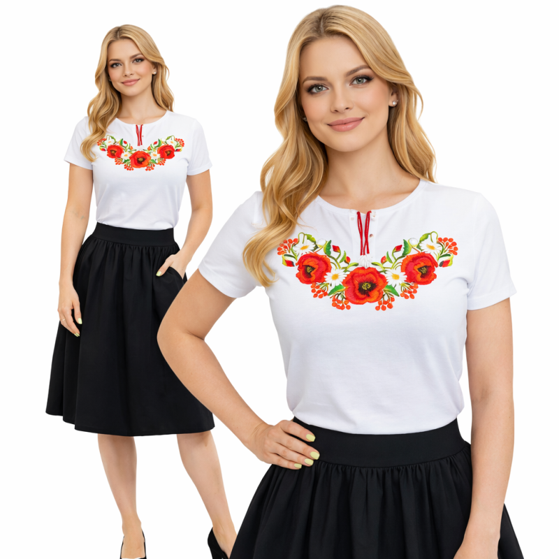 Koszulka damska z krótkim rękawkiem zdobiona haftem w regionalnym stylu. Ozdobne troczki przy dekolcie umożliwiające regulacje jego głębokości.