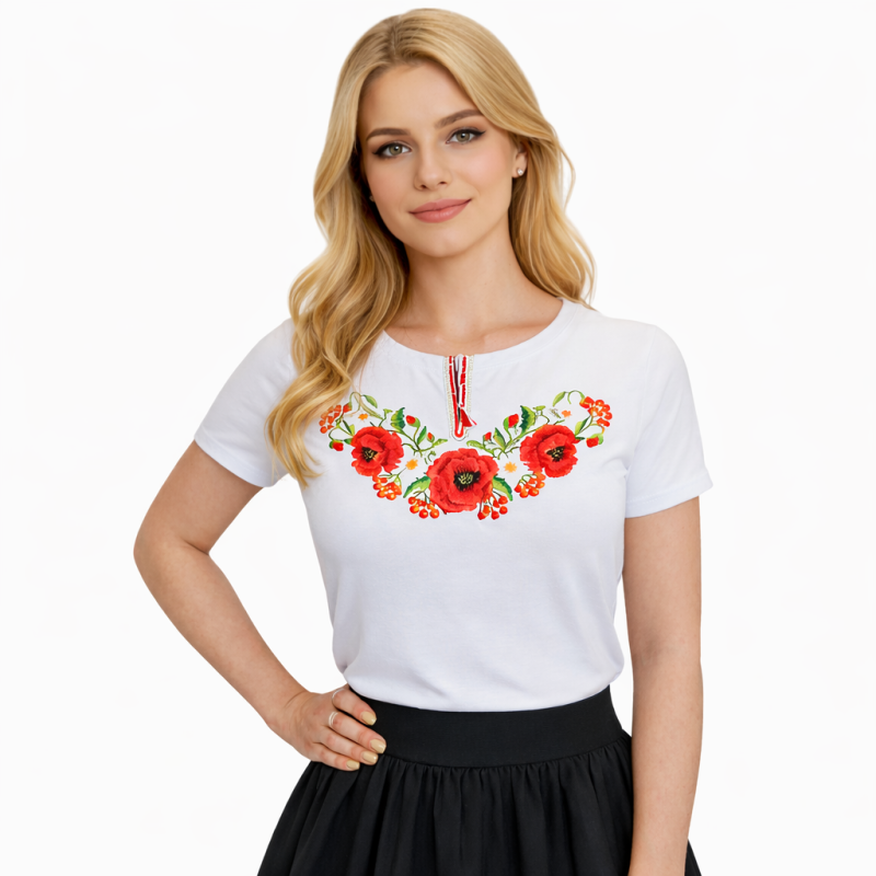 Koszulka damska z krótkim rękawem z haftem przedstawiającym maki to produkt, który łączy w sobie tradycję góralską z nowoczesnymi trendami mody. Dostępna w internetowym sklepie GoralskiCiuszek.pl jest wyrazem dbałości o detale i lokalne dziedzictwo, co widoczne jest w precyzyjnie wykonanym haftem. Koszulka została uszyta z mieszanki bawełny (70%) i wiskozy (30%), zapewniając nie tylko trwałość, ale i komfort noszenia, oferując przy tym delikatność materiału odpowiednią dla skóry. Koszulka posiada regulowane troczki przy dekolcie, które umożliwiają indywidualne dostosowanie głębokości wycięcia, dodając użytkownikom możliwości personalizacji swojego stylu.