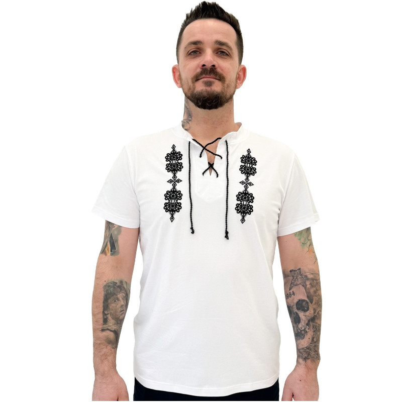 Bawełniana koszulka męska. Zdobiona haftem oraz sznurowaniem, w regionalnym stylu.