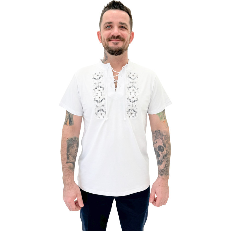 Bawełniana koszulka męska. Zdobiona haftem oraz sznurowaniem, w regionalnym stylu.