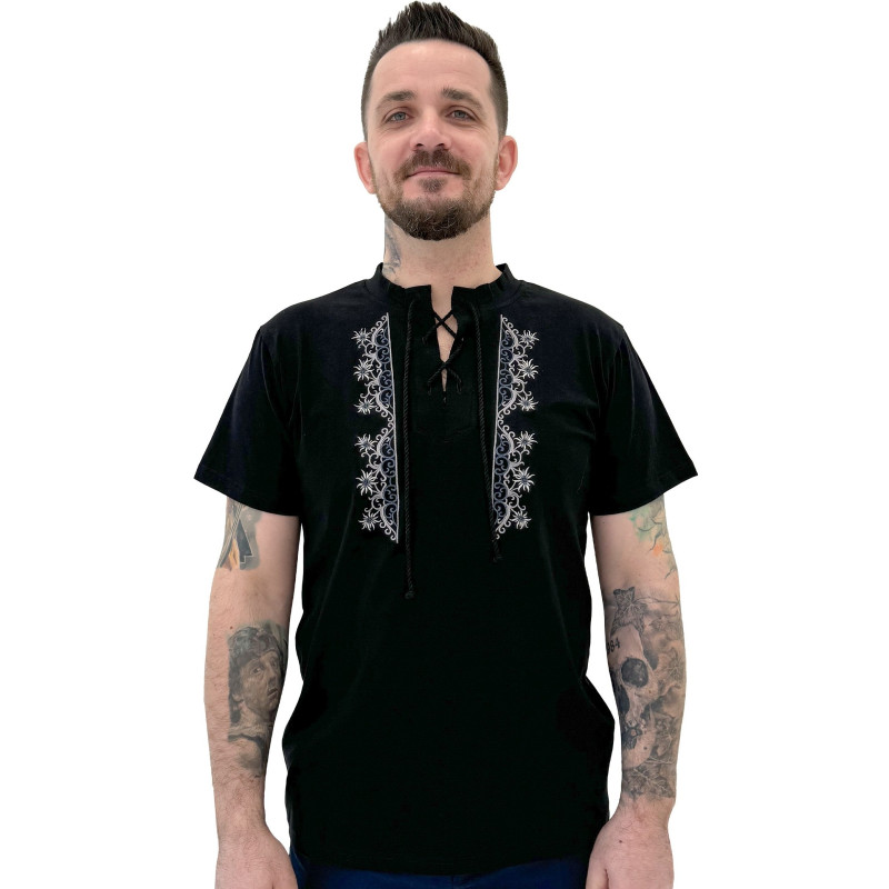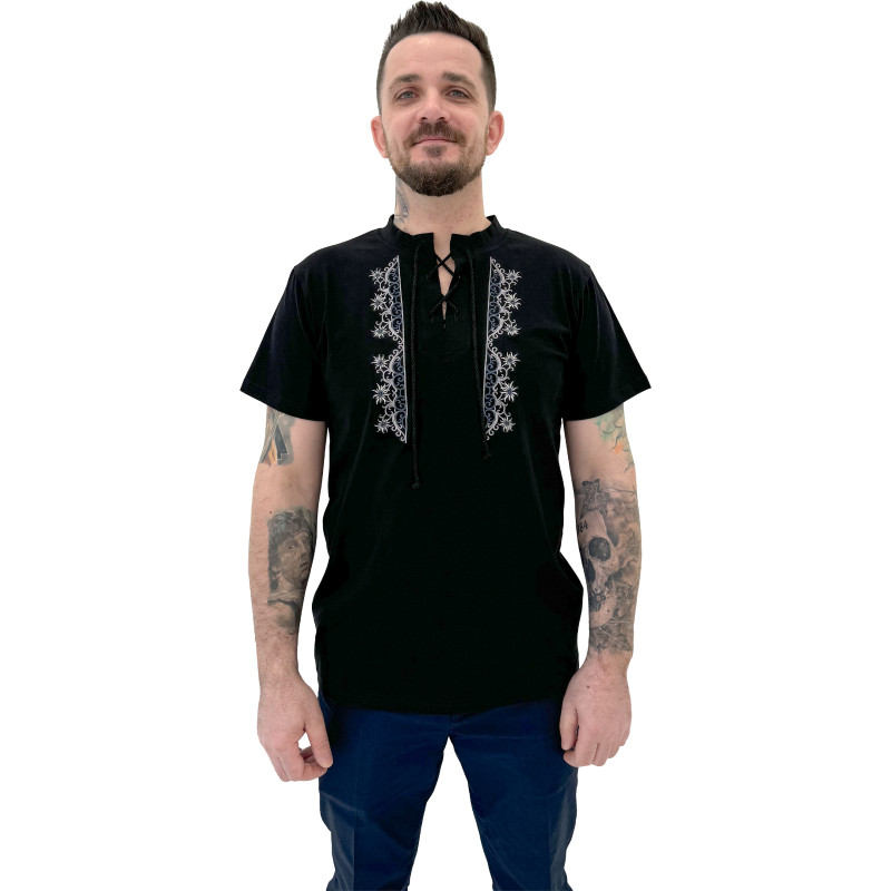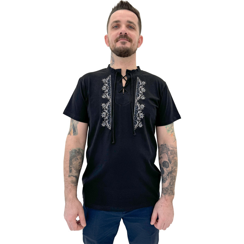 Bawełniana koszulka męska. Zdobiona haftem oraz sznurowaniem, w regionalnym stylu.