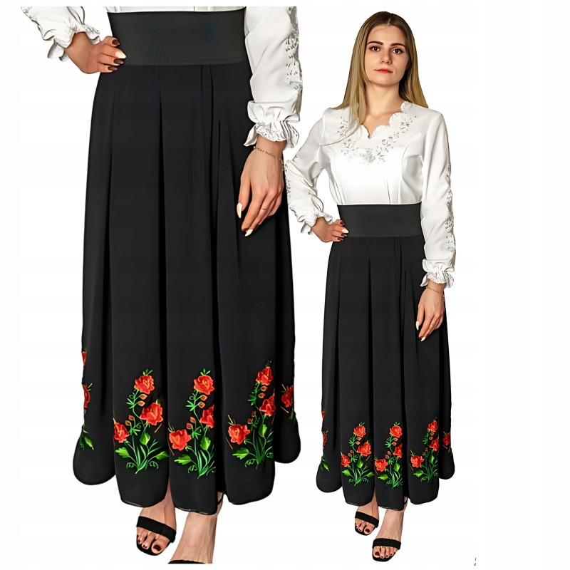 Haftowana spódnica o długości do kostek, wykonana z wysokogatunkowego materiału o dużej odporności. Charakterystyczny, ludowy wzór w całości haftowany. Dzięki delikatnemu plisowaniu oraz szerokiej, elastycznej talii spódnica pięknie układa się na sylwetce.