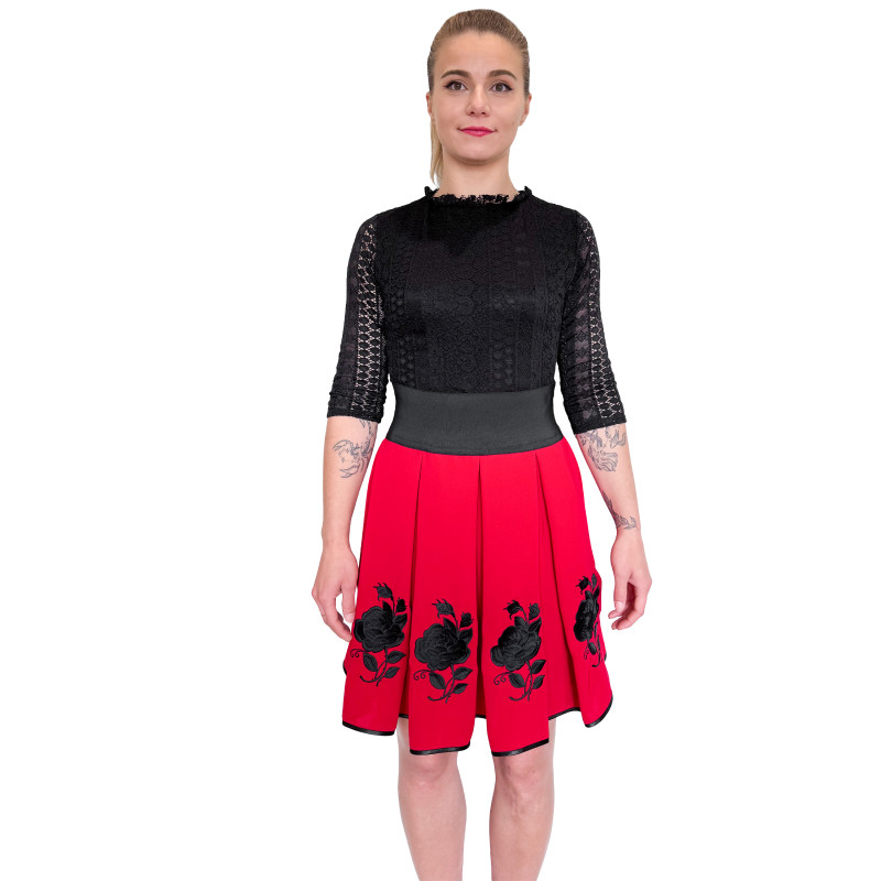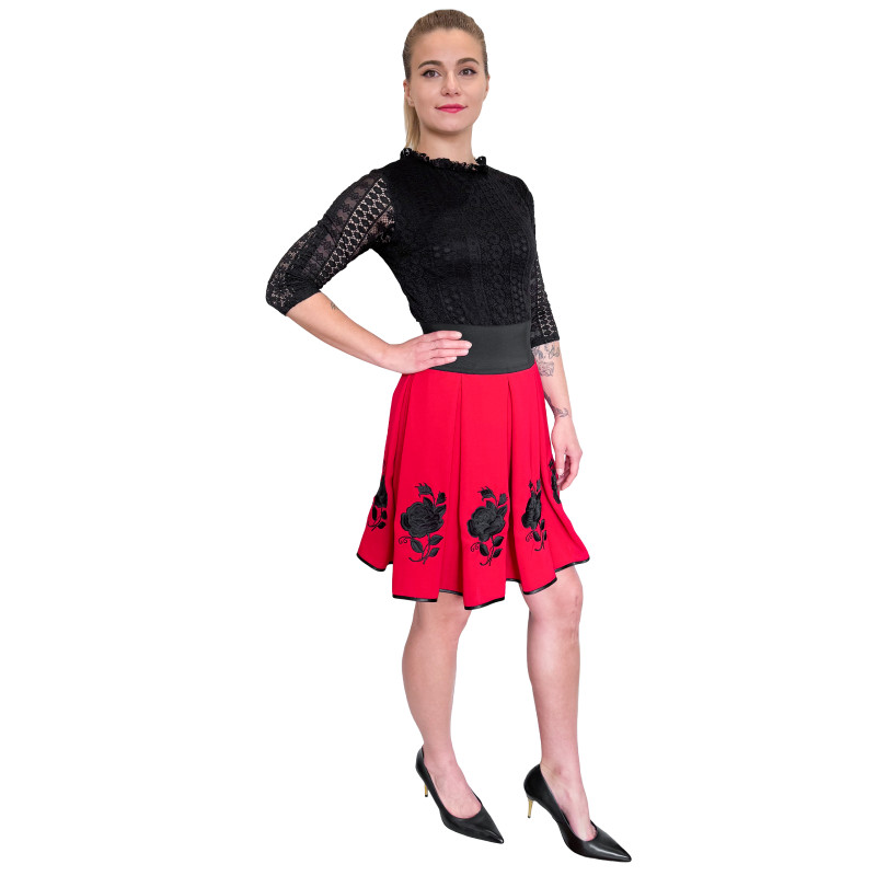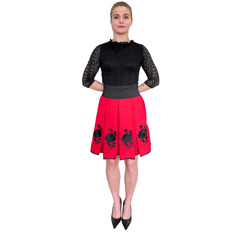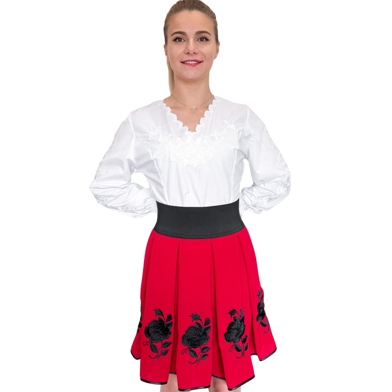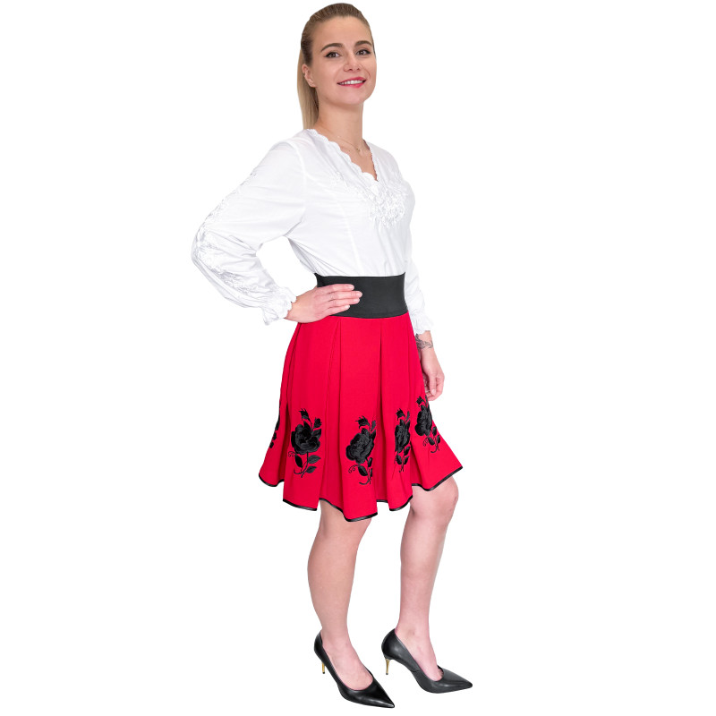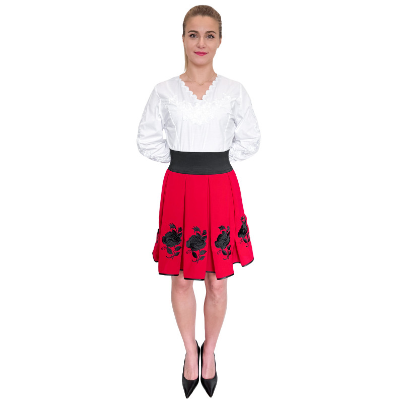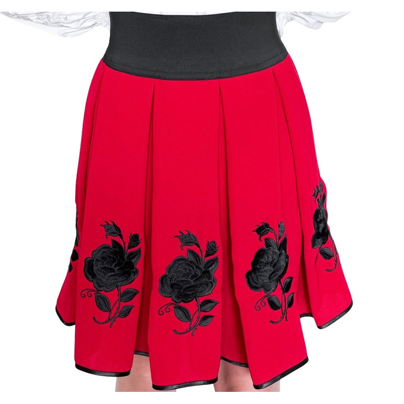 Haftowana spódnica o długości do kolan wykonana z wysokogatunkowego materiału o dużej odporności. Charakterystyczny, ludowy wzór jest w całości przez nas haftowany. Dzięki ozdobnemu plisowaniu oraz szerokiej, elastycznej talii spódnica pięknie układa się na sylwetce.